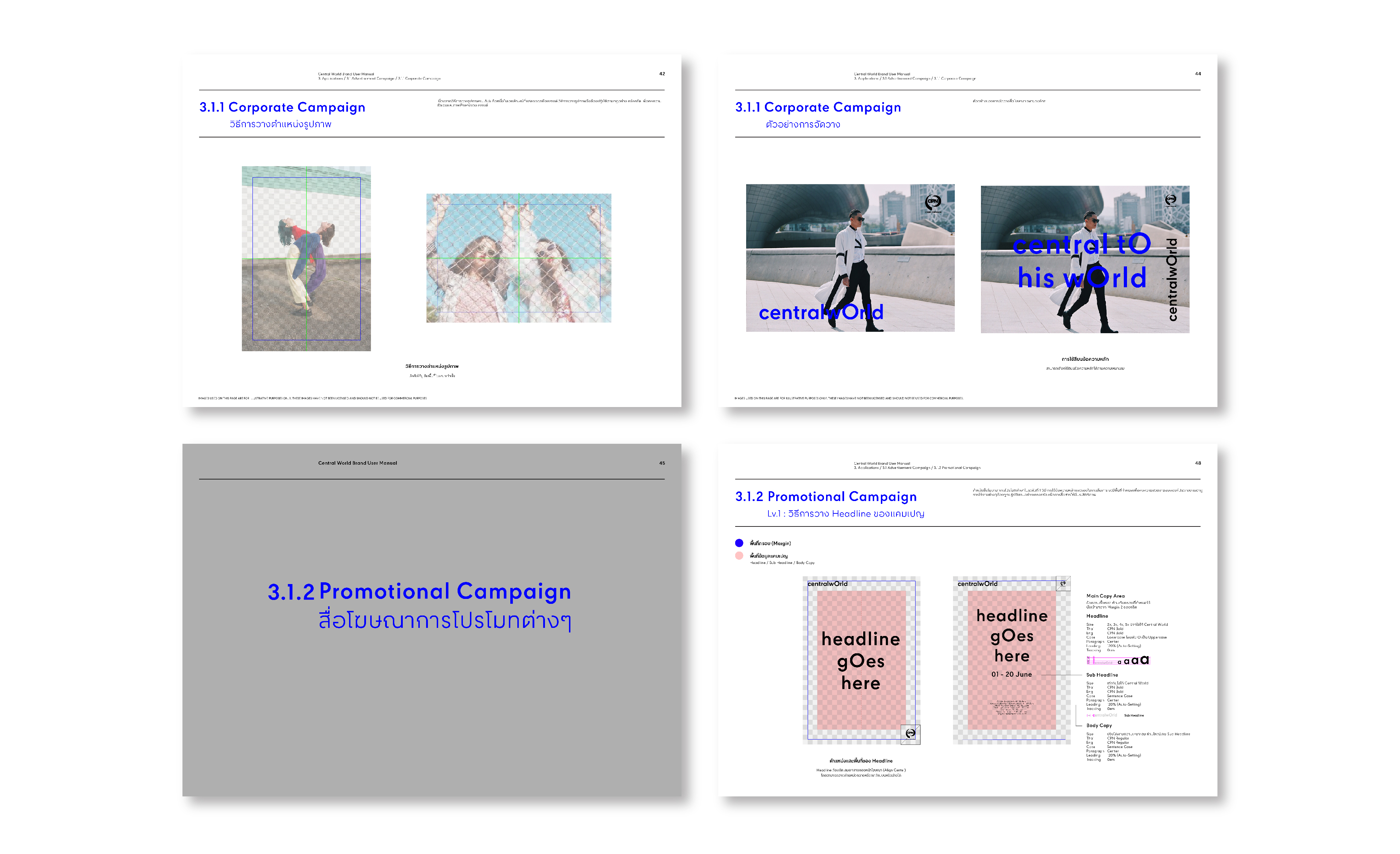 We were asked by Central Pattana Public Company Limited(CPN) to reconfiguring and create the extension version of the corporate identity manual to apply in the local Thai context and usages after North Design(England) has done the logo and identity guidelines. So we try to adopt what North has laid the foundation for the brand and continue to create the extended version of the CI manual to cover photo guidelines in Thai contexts, new grid template for advertising to cover many levels of promotional campaigns, additional applications and touchpoints. In the end we created close to 100 pages(sample pages showing) that cover all areas so that the client can follow this guidelines to strengthen their brand.